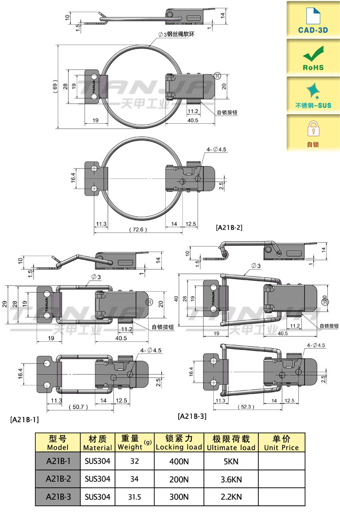 不锈钢材质,耐腐蚀性更强,更耐用。 莱州市天甲五金公司专业致力于工业五金产品的设计、研发、生产和销售,目前产品主要有搭扣(又名箱扣、锁扣,普通搭扣,可调搭扣,自锁搭扣,减震搭扣,橡胶搭扣等),铰链(又名合页,有平开铰链,锌合金铰链),夹具等。产品适用于各种工业领域,尤其在食品、厨具、办公家具、健身器材和医疗机械等领域已被广泛应用。目前公司产品种类达3000余种,已与国内外6000余家工厂建立了长期的合作关系,产品远销欧洲、东南亚等45个国家。 公司以专业的研发团队、成熟的生产工艺和卓越的产品品质为发展方向,讲“TANJA”打造成工业五金行业优秀品牌。 销售:15666540212 电话/微信 QQ212892360