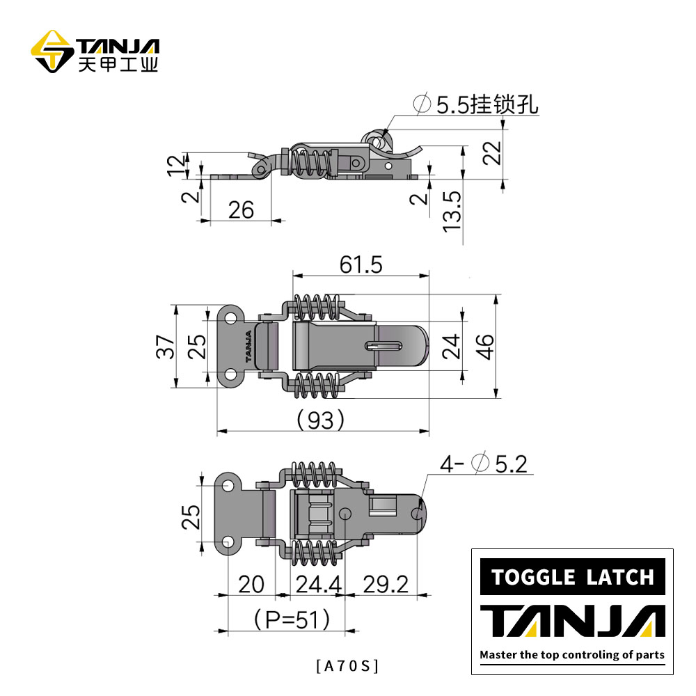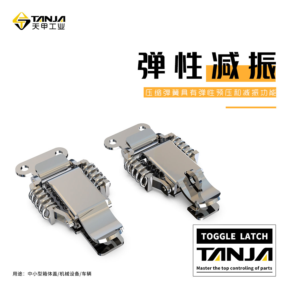 用途:中小型箱体盖、机械设备、车辆。 莱州市天甲五金公司专业致力于工业五金产品的设计、研发、生产和销售,目前产品主要有搭扣(又名箱扣、锁扣,普通搭扣,可调搭扣,自锁搭扣,减震搭扣,橡胶搭扣等),铰链(又名合页,有平开铰链,锌合金铰链),夹具等。产品适用于各种工业领域,尤其在食品、厨具、办公家具、健身器材和医疗机械等领域已被广泛应用。目前公司产品种类达3000余种,已与国内外6000余家工厂建立了长期的合作关系,产品远销欧洲、东南亚等45个国家。 公司以专业的研发团队、成熟的生产工艺和卓越的产品品质为发展方向,讲“TANJA”打造成工业五金行业优秀品牌。 销售部:15666540212 电话/微信 QQ212892360