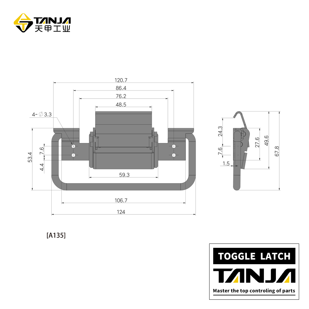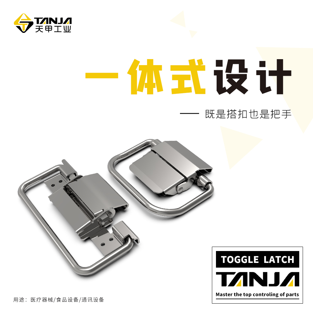 很好的适用于医疗器械、食品设备、通讯设备。 莱州市天甲五金公司专业致力于工业五金产品的设计、研发、生产和销售,目前产品主要有搭扣(又名箱扣、锁扣,普通搭扣,可调搭扣,自锁搭扣,减震搭扣,橡胶搭扣等),铰链(又名合页,有平开铰链,锌合金铰链),夹具等。产品适用于各种工业领域,尤其在食品、厨具、办公家具、健身器材和医疗机械等领域已被广泛应用。目前公司产品种类达3000余种,已与国内外6000余家工厂建立了长期的合作关系,产品远销欧洲、东南亚等45个国家。 公司以专业的研发团队、成熟的生产工艺和卓越的产品品质为发展方向,讲“TANJA”打造成工业五金行业优秀品牌。 北方销售:15666540212 电话/微信 QQ212892360 南方销售:18053556435 电话/微信 QQ2542770428