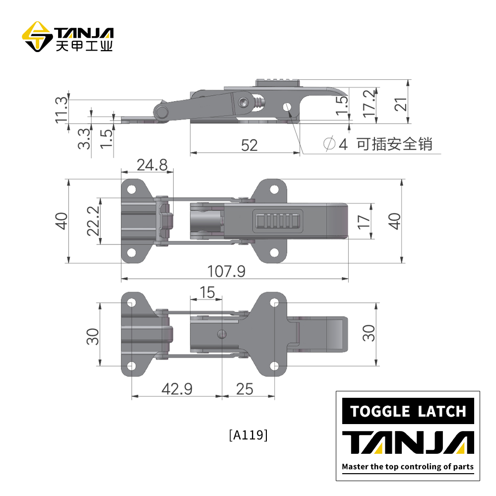 莱州市天甲五金公司专业致力于工业五金产品的设计、研发、生产和销售,目前产品主要有搭扣(又名箱扣、锁扣,普通搭扣,可调搭扣,自锁搭扣,减震搭扣,橡胶搭扣等),铰链(又名合页,有平开铰链,锌合金铰链),夹具等。产品适用于各种工业领域,尤其在食品、厨具、办公家具、健身器材和医疗机械等领域已被广泛应用。目前公司产品种类达3000余种,已与国内外6000余家工厂建立了长期的合作关系,产品远销欧洲、东南亚等45个国家。