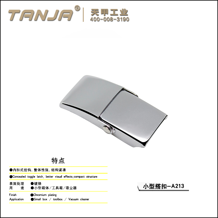 莱州市天甲五金公司专业致力于工业五金产品的设计、研发、生产和销售,目前产品主要有搭扣(又名箱扣、锁扣,普通搭扣,可调搭扣,自锁搭扣,减震搭扣,橡胶搭扣等),铰链(又名合页,有平开铰链,锌合金铰链),夹具等。产品适用于各种工业领域,尤其在食品、厨具、办公家具、健身器材和医疗机械等领域已被广泛应用。目前公司产品种类达3000余种,已与国内外6000余家工厂建立了长期的合作关系,产品远销欧洲、东南亚等45个国家。