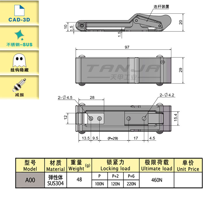 莱州市天甲五金公司专业致力于工业五金产品的设计、研发、生产和销售,目前产品主要有搭扣(又名箱扣、锁扣,普通搭扣,可调搭扣,自锁搭扣,减震搭扣,橡胶搭扣等),铰链(又名合页,有平开铰链,锌合金铰链),夹具等。产品适用于各种工业领域,尤其在食品、厨具、办公家具、健身器材和医疗机械等领域已被广泛应用。