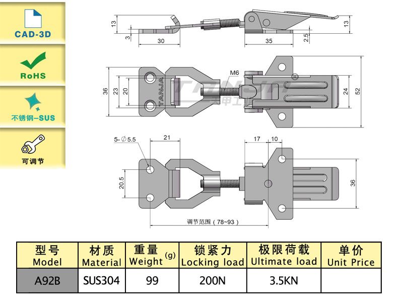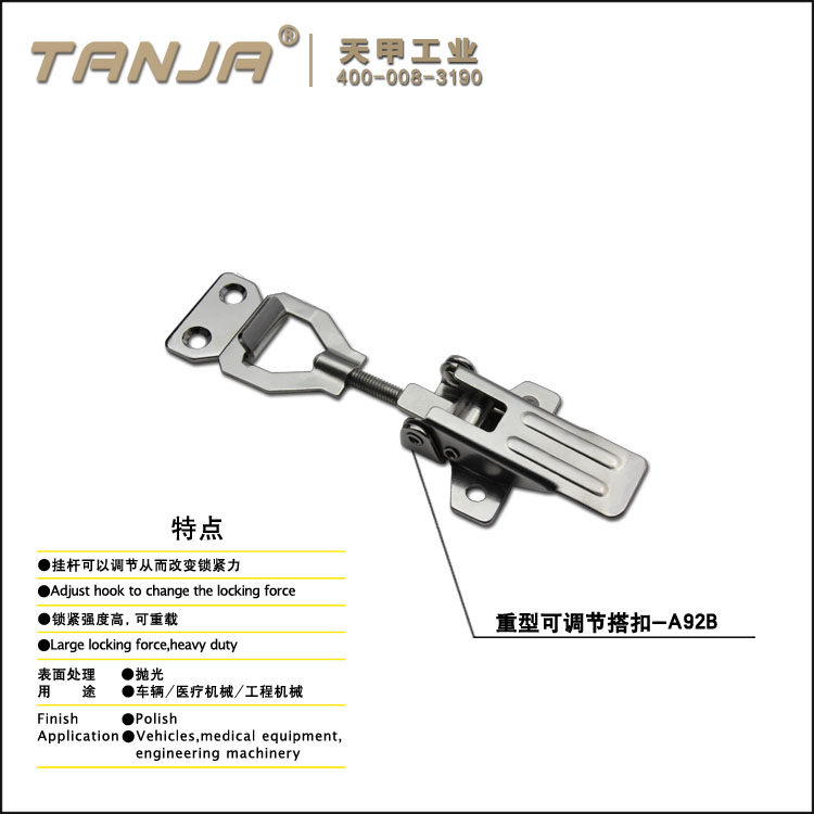 莱州市天甲五金公司专业致力于工业五金产品的设计、研发、生产和销售,目前产品主要有搭扣(又名箱扣、锁扣,普通搭扣,可调搭扣,自锁搭扣,减震搭扣,橡胶搭扣等),铰链(又名合页,有平开铰链,锌合金铰链),夹具等。产品适用于各种工业领域,尤其在食品、厨具、办公家具、健身器材和医疗机械等领域已被广泛应用。
