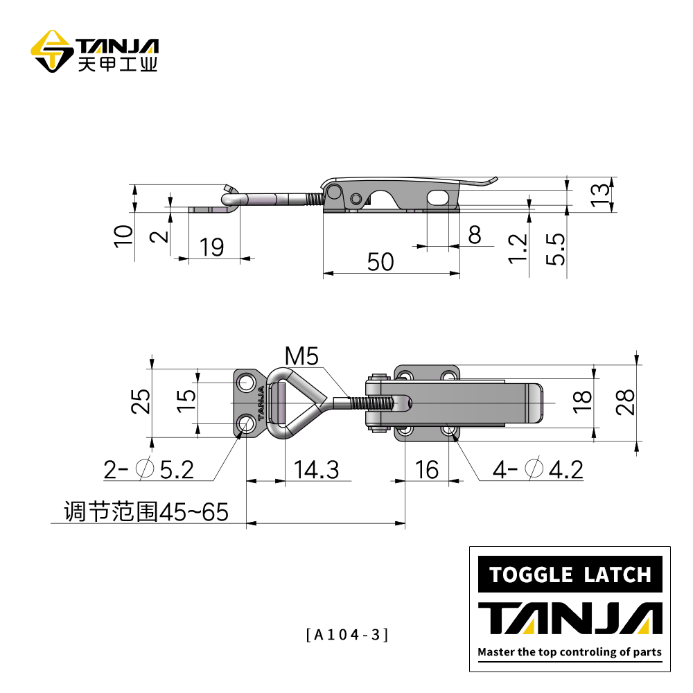 莱州市天甲五金公司专业致力于工业五金产品的设计、研发、生产和销售,目前产品主要有搭扣(又名箱扣、锁扣,普通搭扣,可调搭扣,自锁搭扣,减震搭扣,橡胶搭扣等),铰链(又名合页,有平开铰链,锌合金铰链),夹具等。产品适用于各种工业领域,尤其在食品、厨具、办公家具、健身器材和医疗机械等领域已被广泛应用。