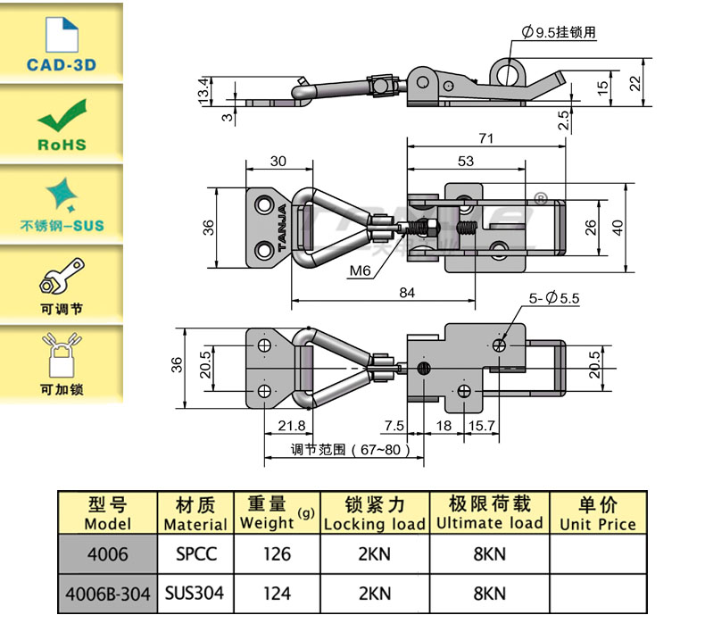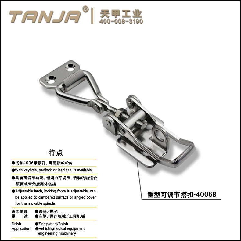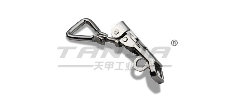 莱州市天甲五金公司专业致力于工业五金产品的设计、研发、生产和销售,目前产品主要有搭扣(又名箱扣、锁扣,普通搭扣,可调搭扣,自锁搭扣,减震搭扣,橡胶搭扣等),铰链(又名合页,有平开铰链,锌合金铰链),夹具等。产品适用于各种工业领域,尤其在食品、厨具、办公家具、健身器材和医疗机械等领域已被广泛应用。
