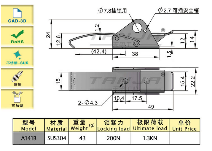 无需挂钩使搭扣更加简洁大方 我们主要销售的产品有 生产、销售:箱扣锁具、合页。把手、五金配件,我们的地址是山东烟台莱州市 城港路街道开明路1139号。 电话/微信:15666540212 QQ:212892360 欢迎联系我们,莱州天甲五金有限公司对您的咨询非常感谢 。