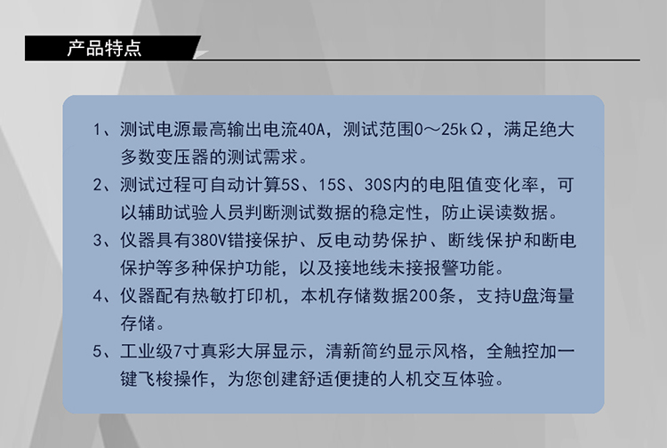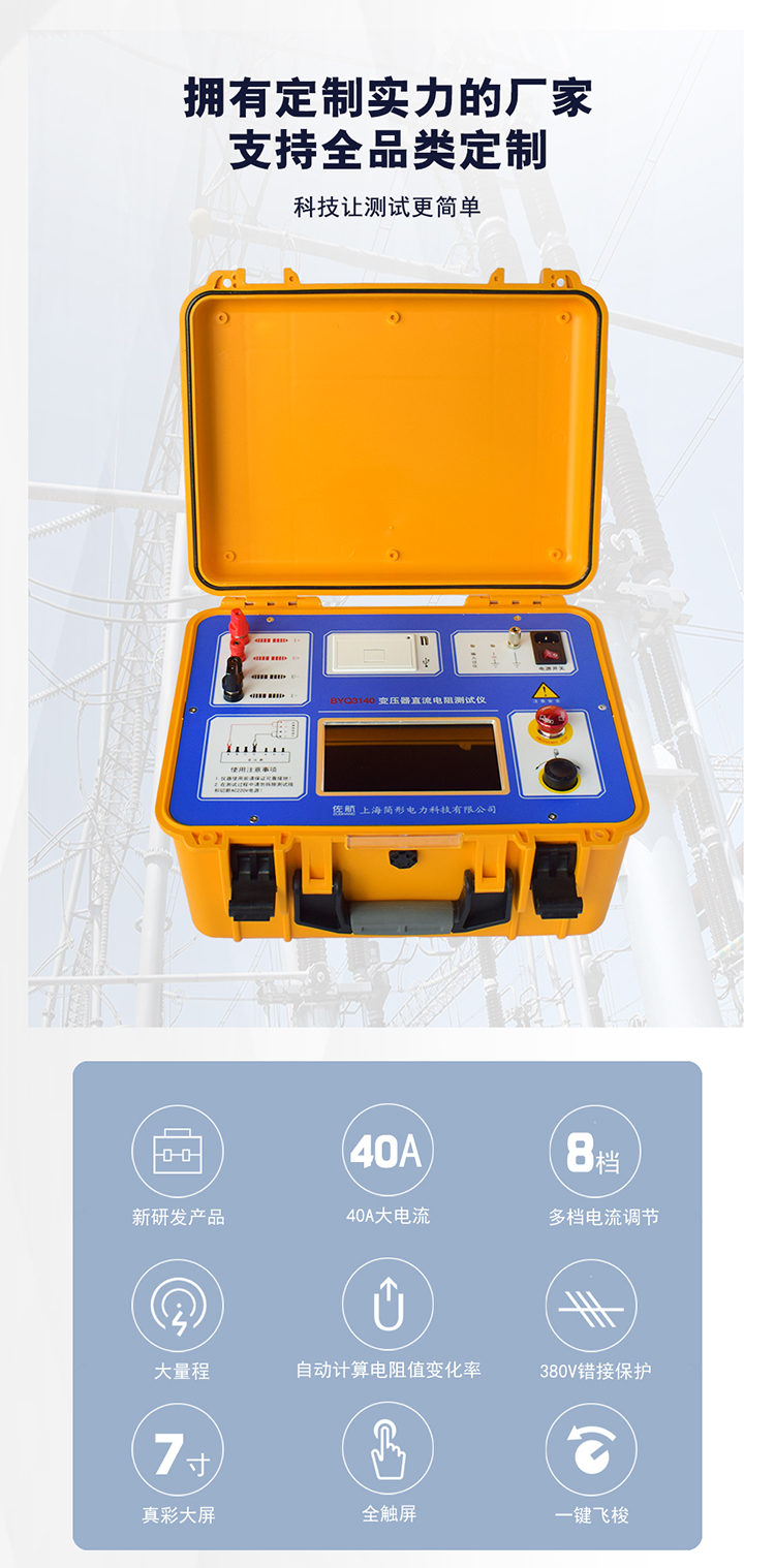 交接试验及电力部门预防性试验的必测项目,能有效发现变压器线圈的选材、焊接、连接部位松动、缺股、断线等制造缺陷和运行后存在的隐患。为了满足变压器直流电阻快速测量的需要,我公司利用自身技术优势研制了变压器直流电阻测试仪。