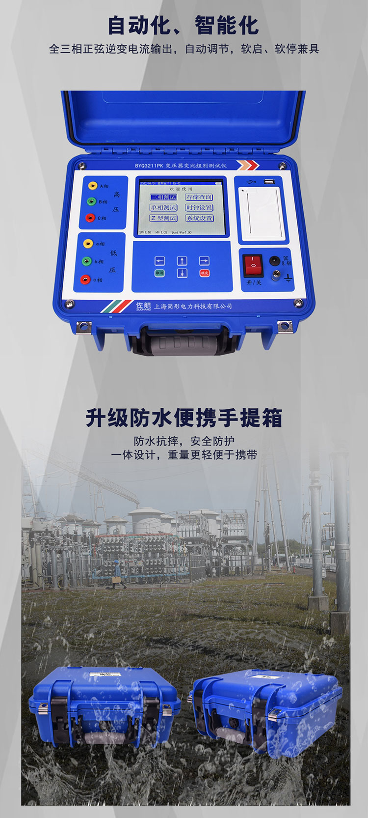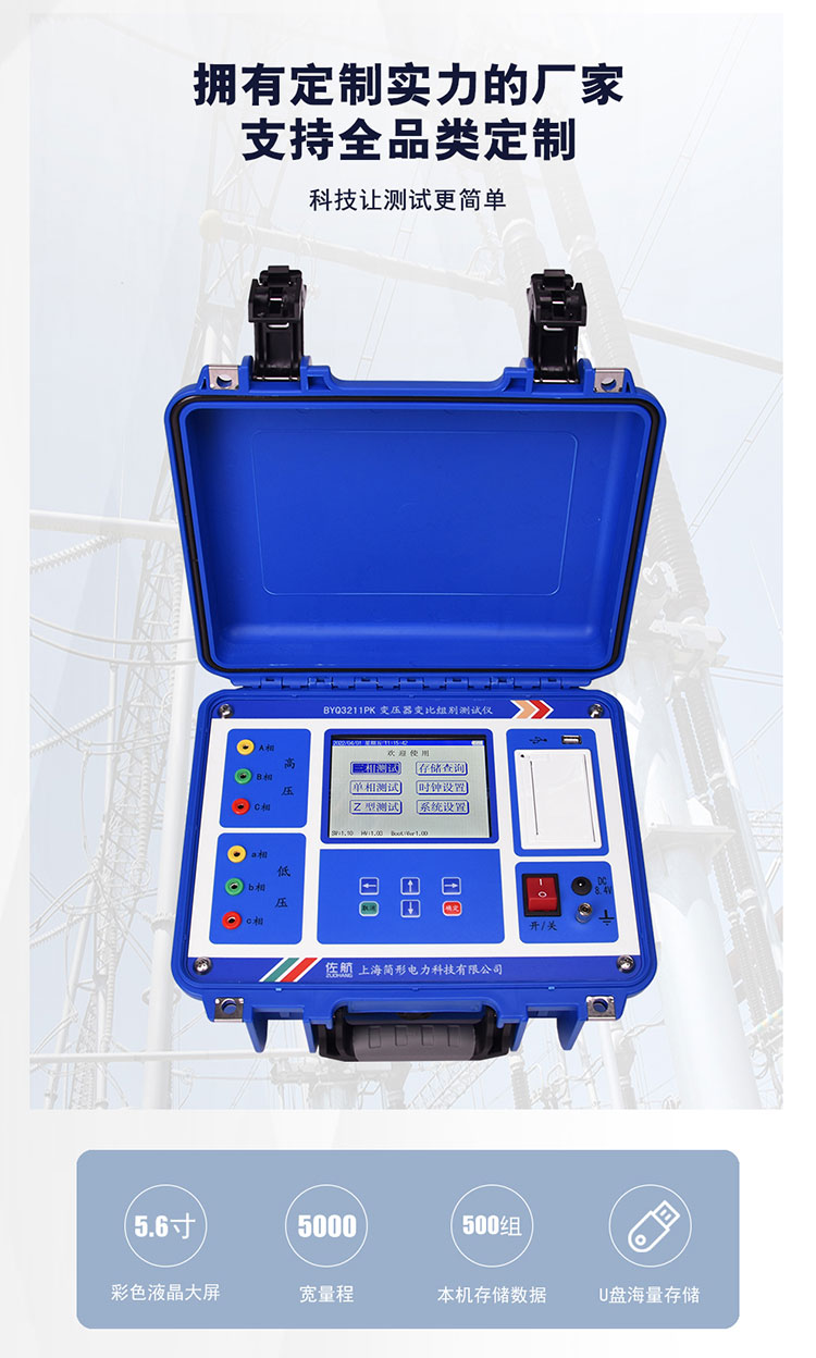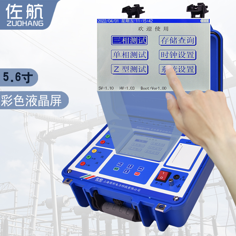 佐航 BYQ3211PK变压器变比组别测试仪是一款创新型产品,克服了传统变比电桥测试的缺点,屏幕采用了大屏幕高分辨率液晶显示屏,供电采用锂电供电,方便现场使用。