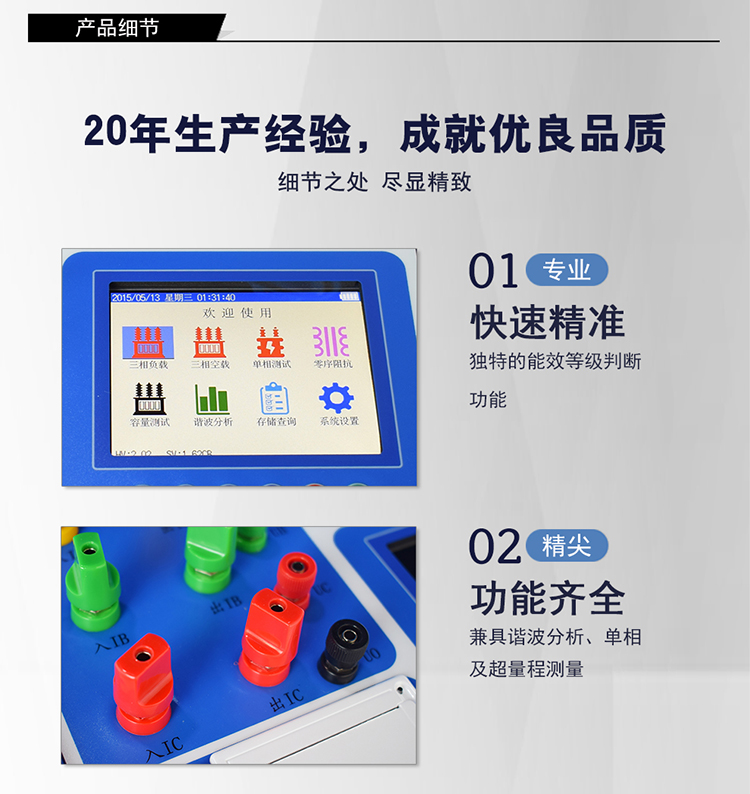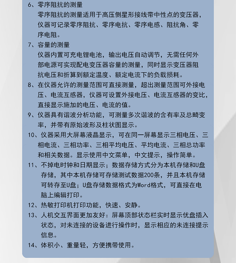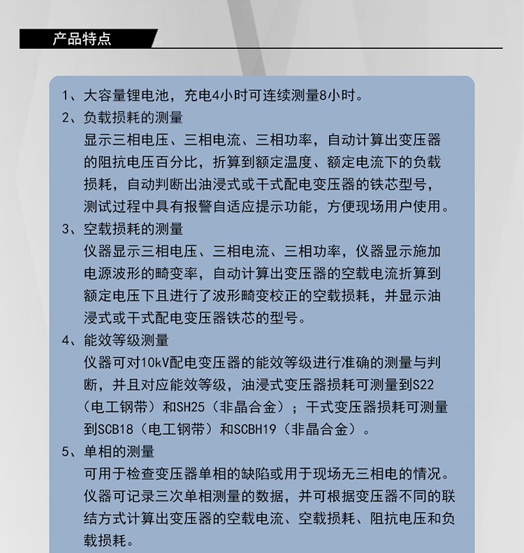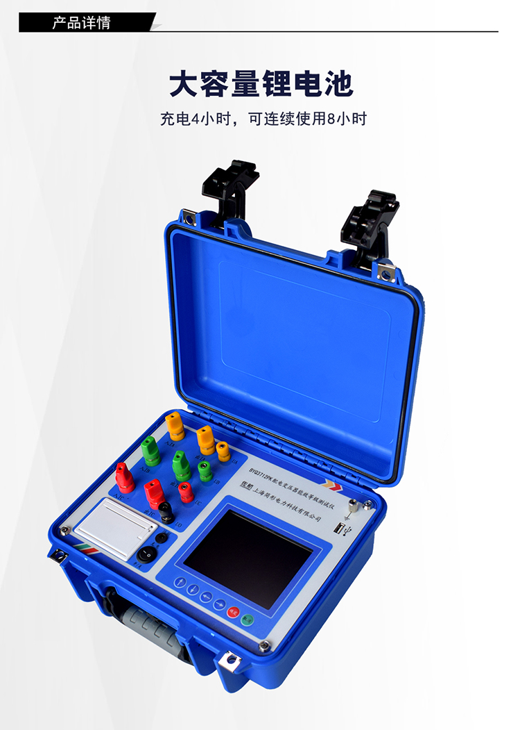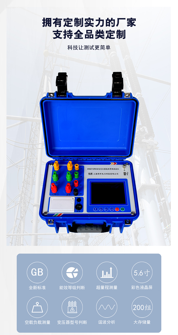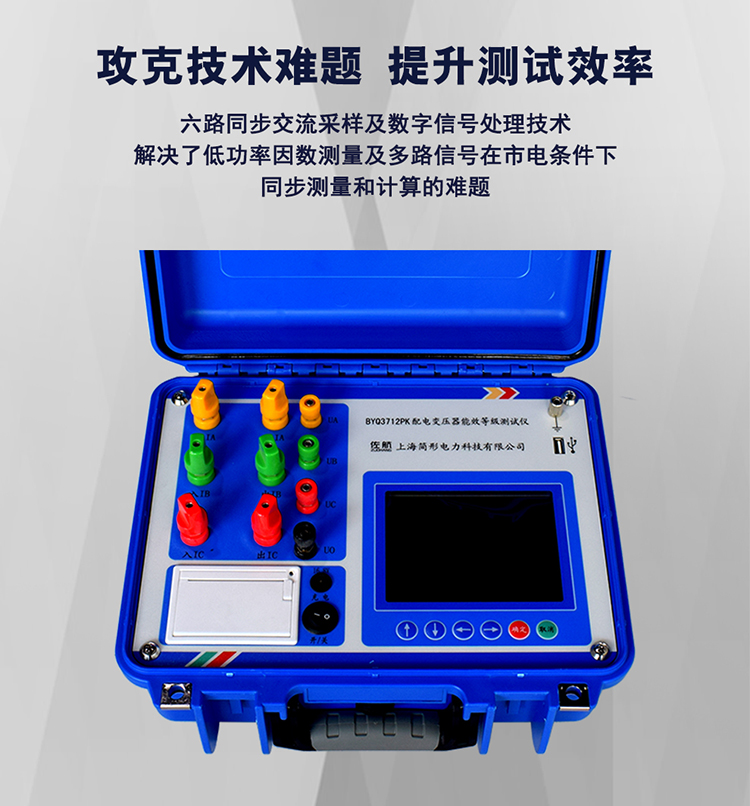 佐航BYQ3712PK变压器能效等级测试仪是用于配电电力变压器容量测量、变压器空载及短路损耗测量的仪器,并具有谐波分析功能。仪器内部采用六路同步交流采样及数字信号处理技术,成功解决了低功率因数测量及多路信号在市电条件下同步测量和计算的难题。同时引入了必要的校正,体积小,重量轻,操作简单方便,数据准确可靠,可显示并记录所有测量数据,可作为现场高精度交流指示仪表使用。大容量锂电池。