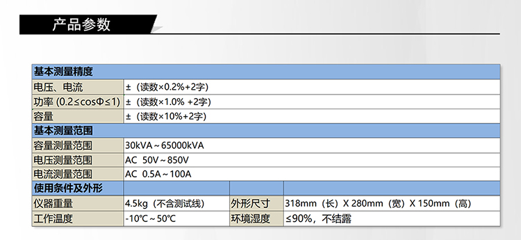 2)容量测量范围: 30kVA~65000kVA