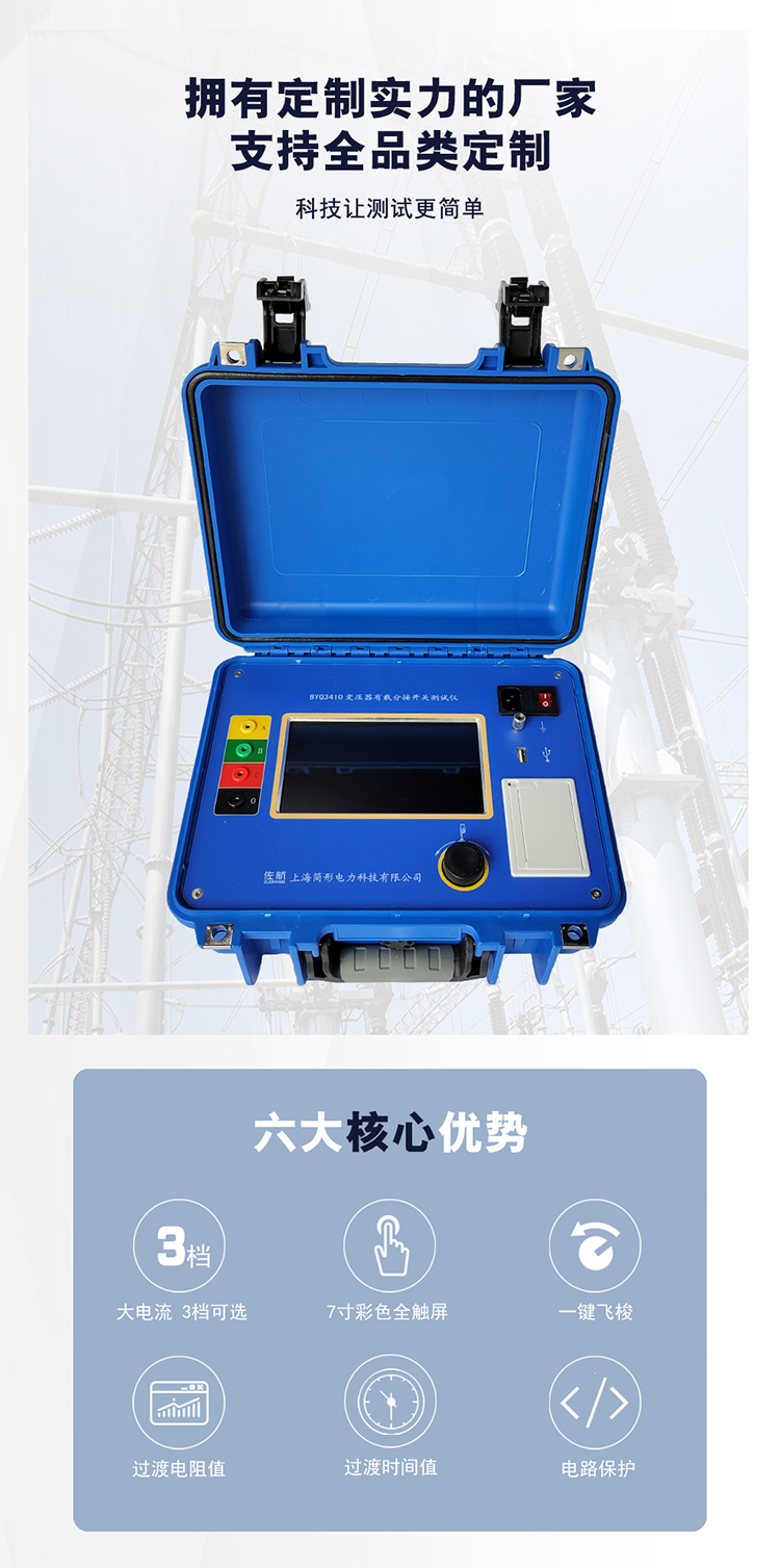 有载分接开关是与变压器回路连接的wei一运动部件,因此有载分接开关的检测,越来越引起重视。在《电力设备交接和预防性试验规程》中,要求检查有载分接开关的动作顺序,测量切换时间等。为此,我公司成功的研制了BYQ3410有载分接开关测试仪,该仪器主要用于测量变压器有载分接开关的过渡波形、过渡时间、各瞬间过渡电阻值、三相同期性等。