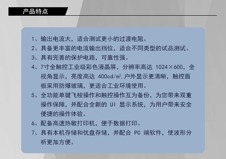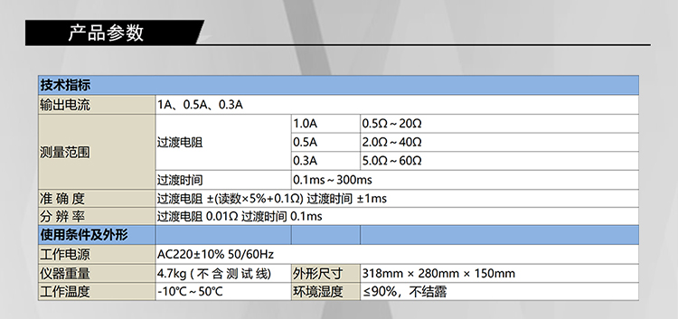 4) 分辨率:过渡电阻 0.01Ω 过渡时间 0.1ms