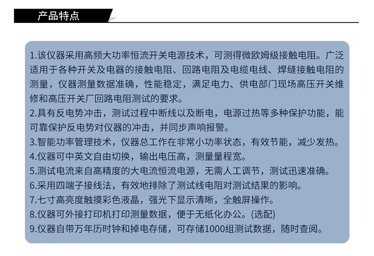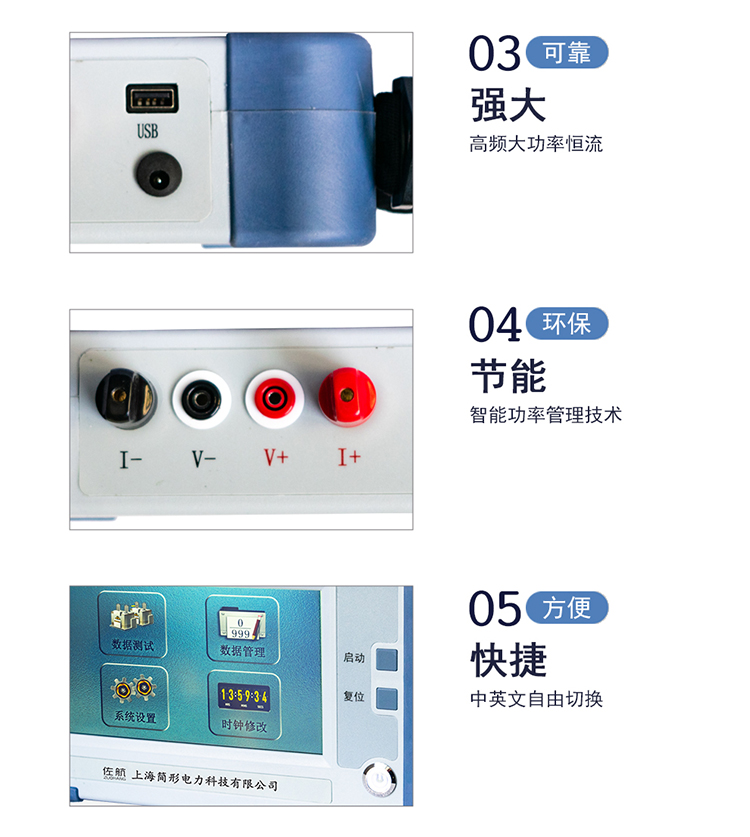 4)测试电流来自高精度的大电流恒流电源,无需人工调节,测试迅速准确。