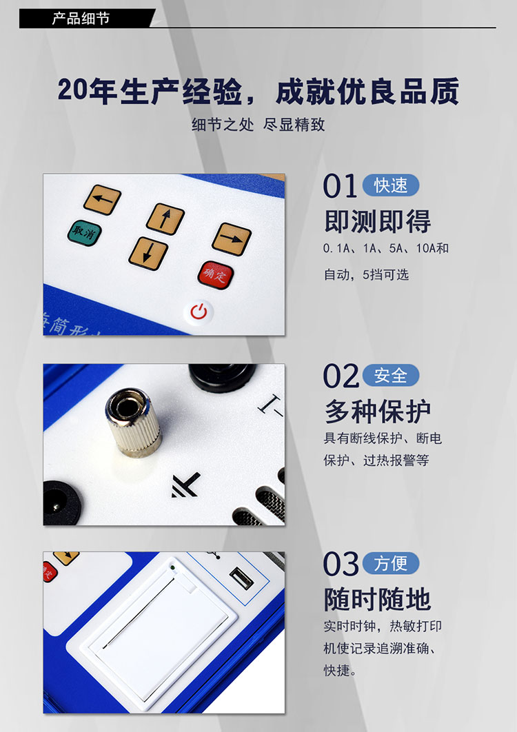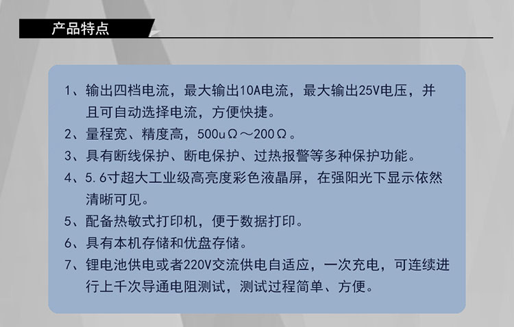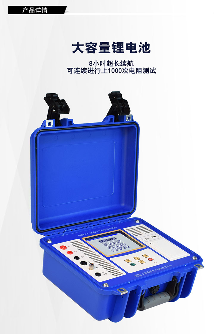 1)锂电池供电或者220V交流供电自适应,一次充电,可连续进行上千次导通电阻测试,测试过程简单、方便。