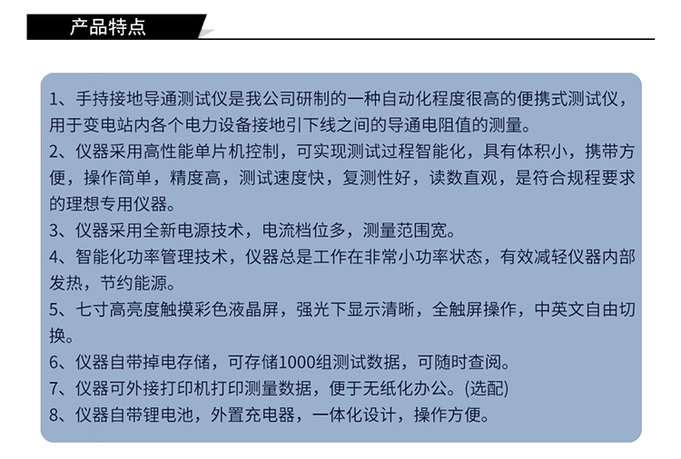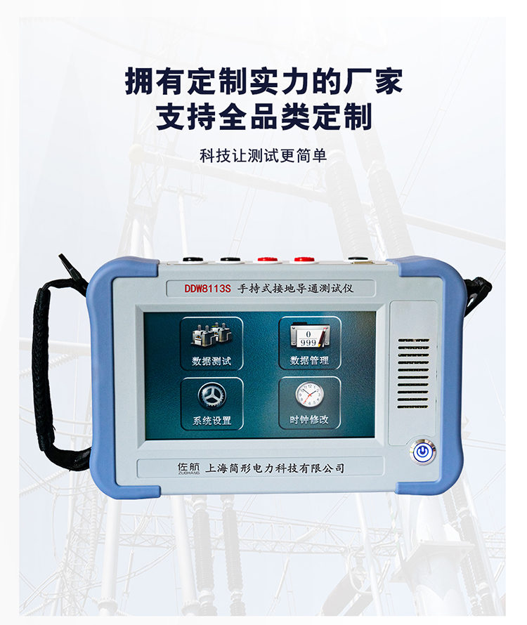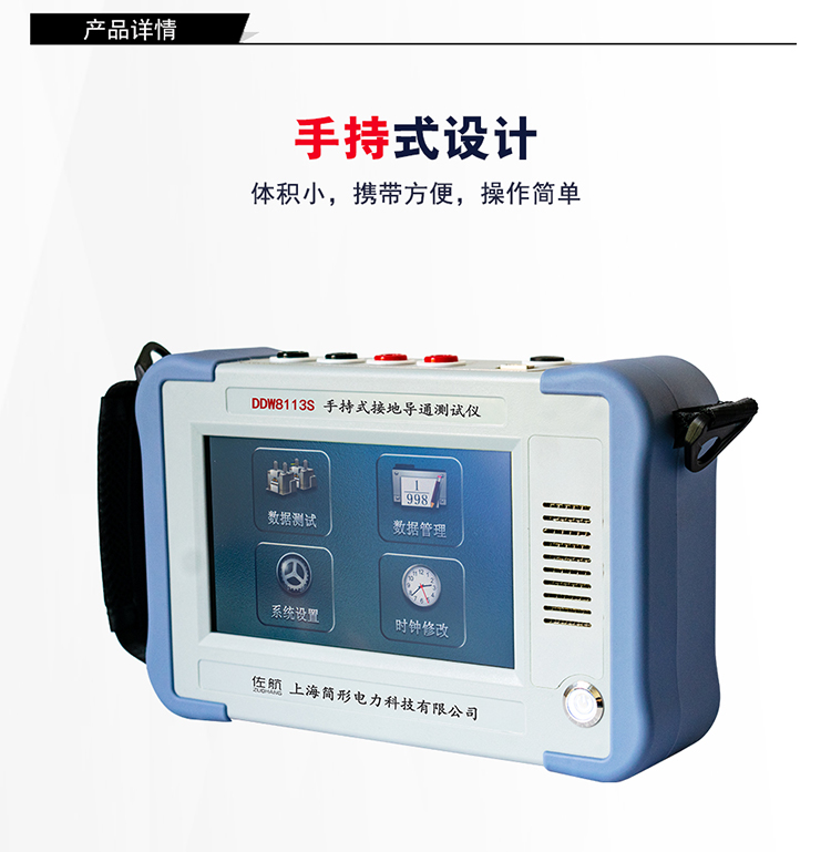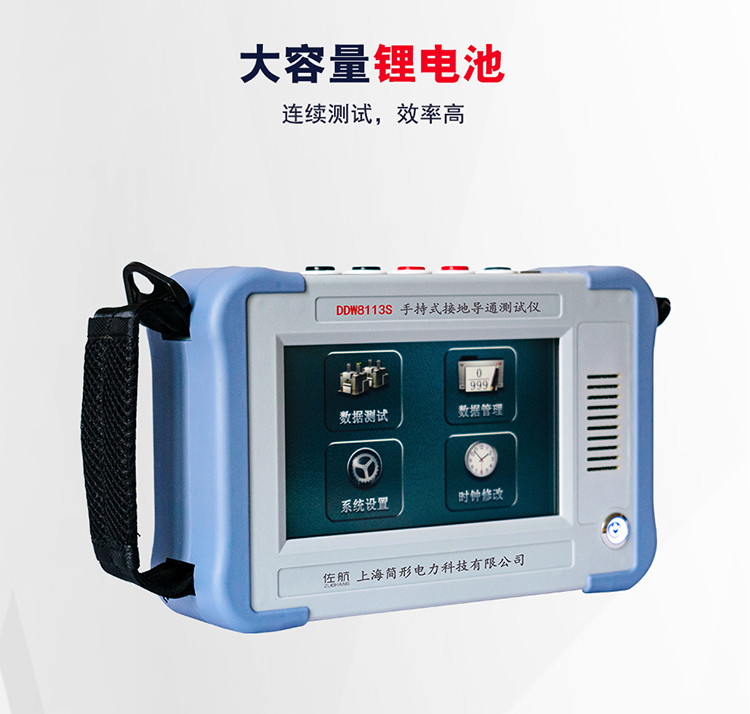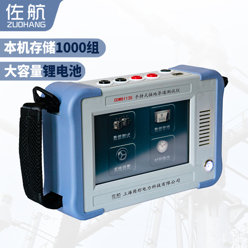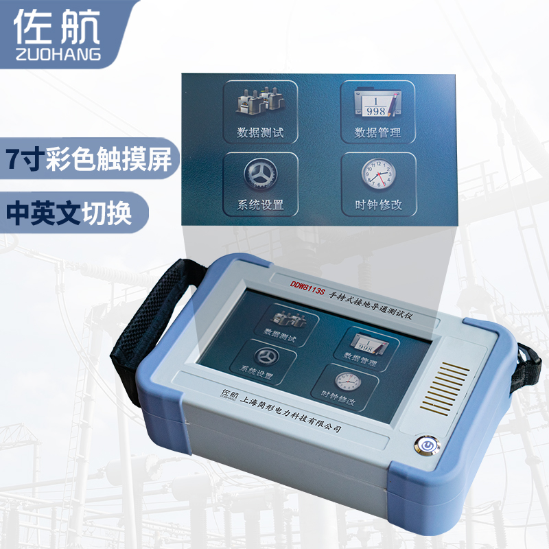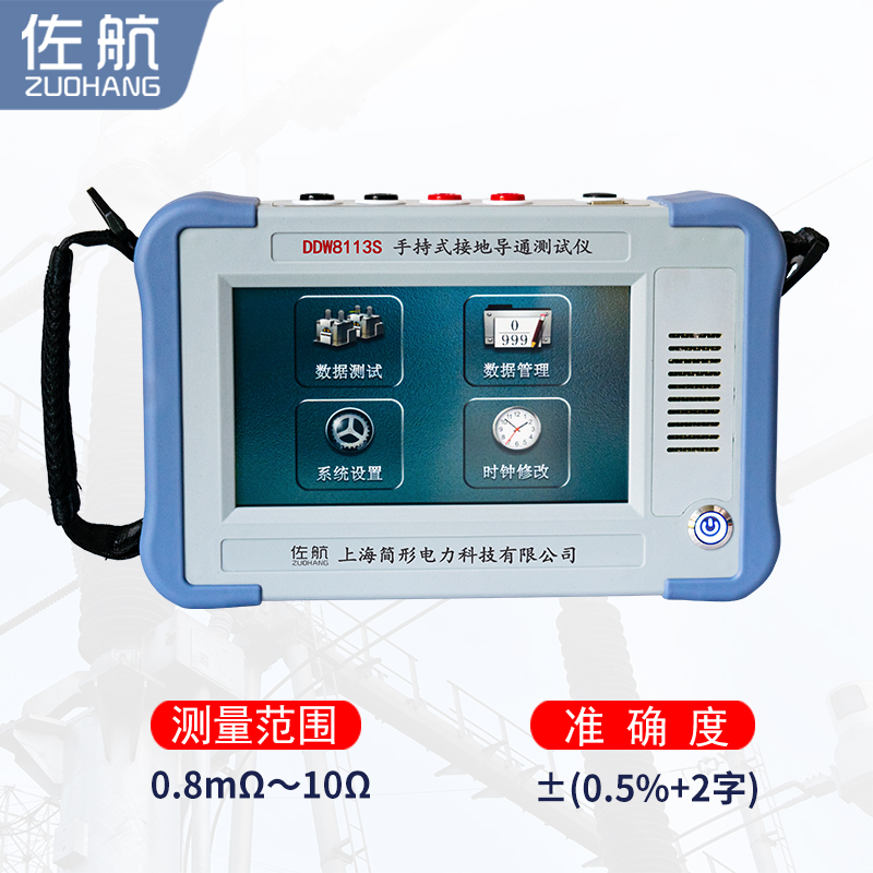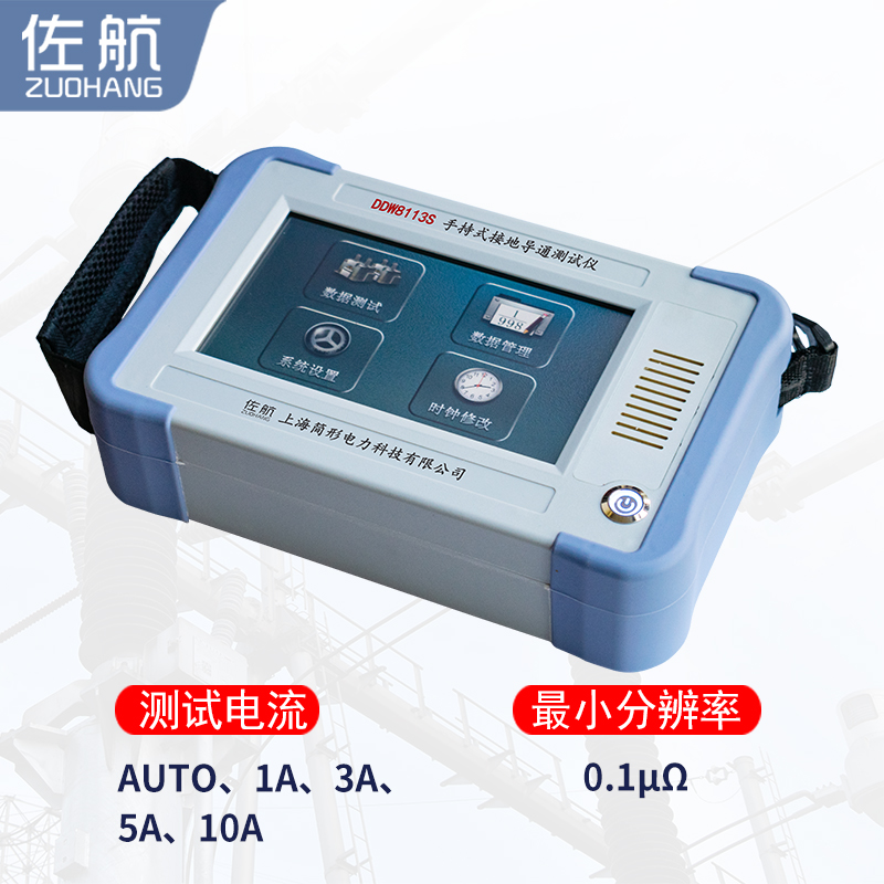 佐航DDW8113S手持式接地导通测试仪是我公司研制的一种自动化程度很高的便携式测试仪,用于变电站内各个电力设备接地引下线之间的导通电阻值的测量。仪器采用高性能单片机控制,可实现测试过程智能化,具有体积小,携带方便,操作简单,精度高,测试速度快,复测性好,读数直观,是符合规程要求的lixiang专用仪器。