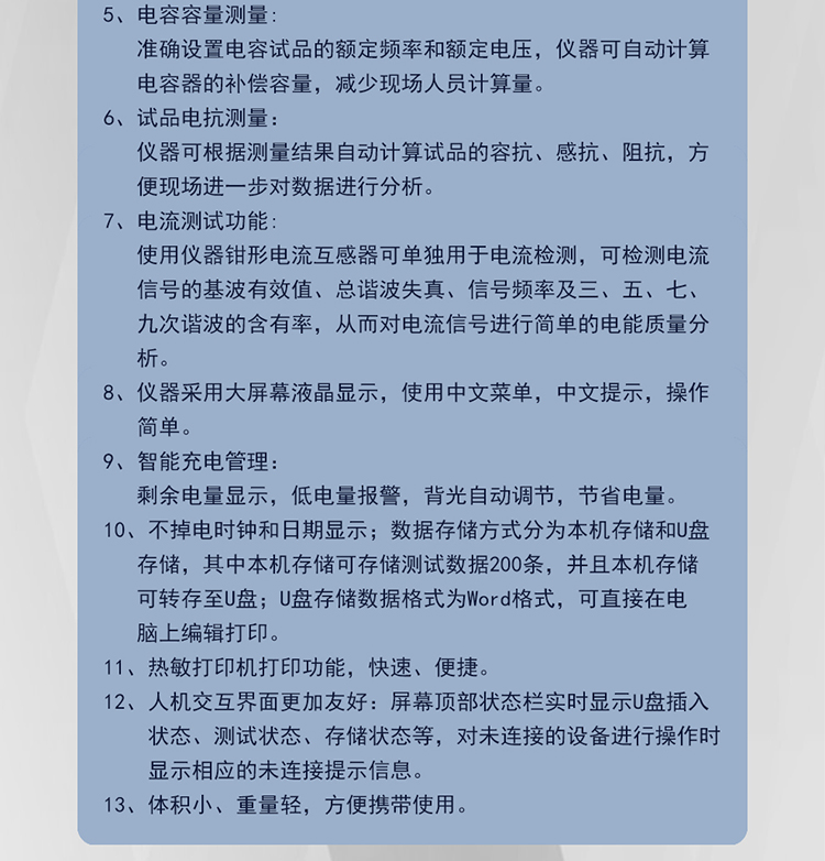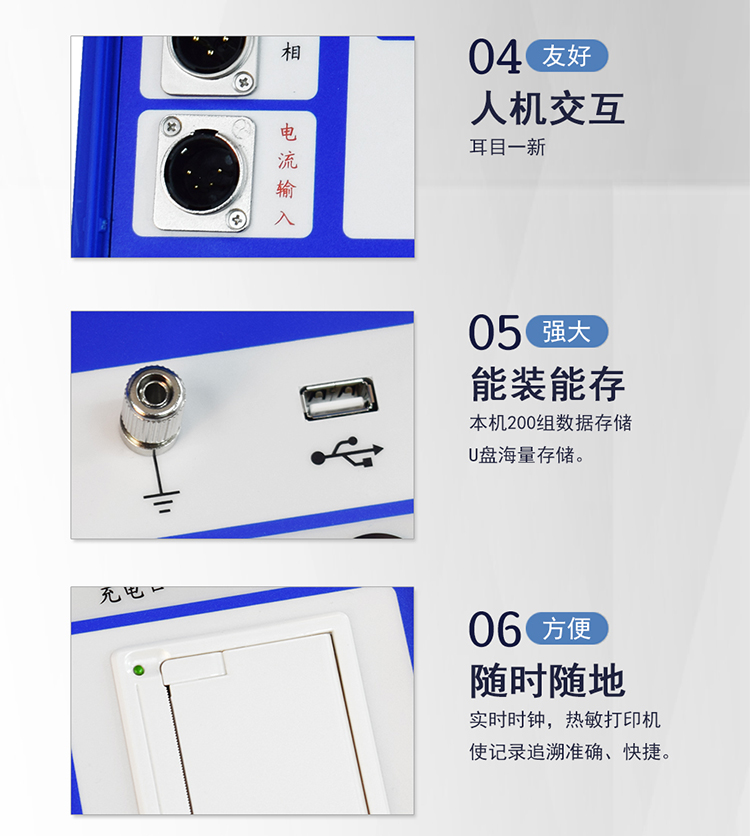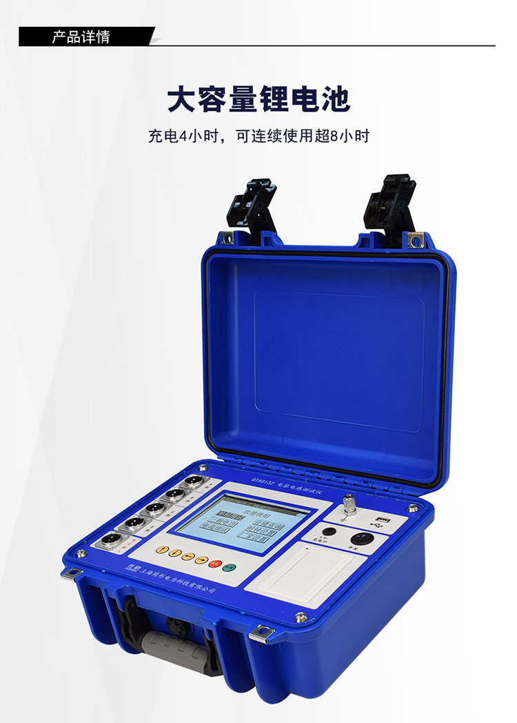 仪器内置大容量锂电池,现场测试时无需交流电源即可进行测量,并且测量时间长,使