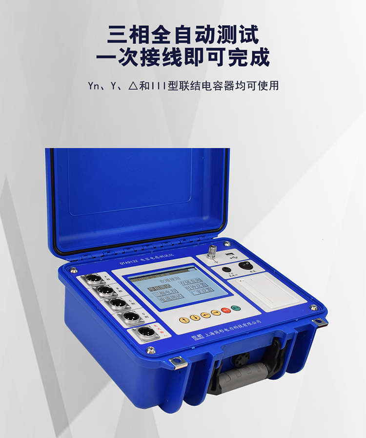 仪器具有三相电源输出及接口,可对三相 Y 型联结电容器、三相 Yn 型联结电容器、三