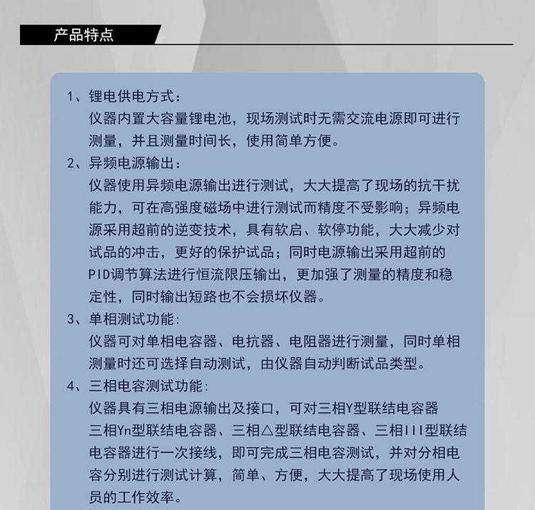进行测试而精度不受影响;异频电源采用xianjin的逆变技术,具有软启、软停功能,大