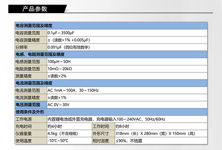 电容测量精度: ±(读数×1% 0.005 μ F)